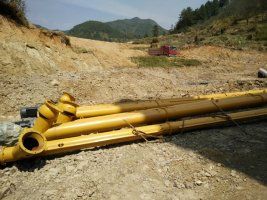 水泥倉螺旋輸送機水泥等粉料的輸送必須在完全密封的腔體內進行,以免污染環境和輸送物料受潮。 O 形截面的螺旋輸送機是應用廣泛的粉料供料輸送裝置。其機殼采用無縫鋼管,常見規格有?219、?273、?325。機殼尾部進口通過球形絞鏈與筒倉翻板門連接,頭部出口通過帆布袋柔軟連接通向主體上的粉料秤斗。安裝傾角一般在 30° ~ 45° 之間,必要時可達 60° 。螺旋的長度不應超過 14m ,可通過更換中間節段得到不同的螺旋總長度。更長的輸送距離可通過螺旋接力的方式實現,接續螺旋設置兩個進料口。機殼中的旋轉體由芯管與連續式的螺旋葉片組焊而成,中間節段的旋轉體采用中間支承和無油潤滑的聯軸節。螺旋體的直徑 D=φ - 2 ( b+δ )其中: φ 與 b 為機殼的外徑與壁厚, δ 為旋轉體與機殼的間隙, δ/D 值以 0.04 ~ 0.05 為宜,芯管直徑 d 一般按旋轉體直徑 D 的三分之一左右選擇。螺旋節距t=0.8D. 螺旋轉速 n 的范圍一般為150~300rpm,應用較多的為160 rpm和210 rpm。